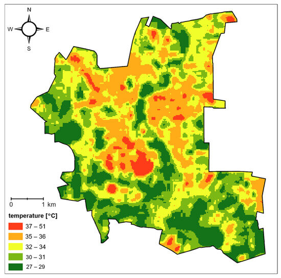 As it had been previously assumed, the highest weights were assigned to the dominant factors in this research topic. The weight of the land-use factor was 19.50% and that of NDVI was 16.91%. The least important criterion of those selected for analysis was distance from sports and recreational facilities, with a weight of 1.72%.