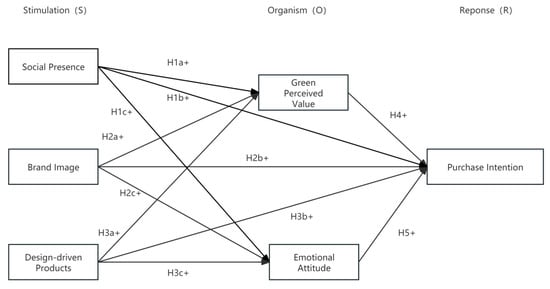 In summary, this study establishes a structural equation model based on the SOR framework, hypothesizing that social presence, brand image, and design-driven attributes influence green perceived value and emotional attitude, thereby affecting consumers’ purchase intention (Figure 1).