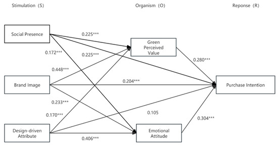 - Green perceived value (β = 0.280; p < 0.001) and emotional attitude (β = 0.280; p < 0.001) both have a positive influence on purchase intention, so hypotheses H4 and H5 are supported. According to the SOR theory, the information obtained during live streaming serves as an external stimulus that inevitably influences consumers’ internal perceptions and attitudes [42]. When consumers are effectively stimulated by environmental value, it triggers their evaluation, which ultimately impacts their purchase decisions. Green perceived value provides a rational basis for consumers, while emotional attitude enhances purchase intention through emotional resonance. In the highly interactive context of live streaming, the combined effects of theses factors become pronounced.