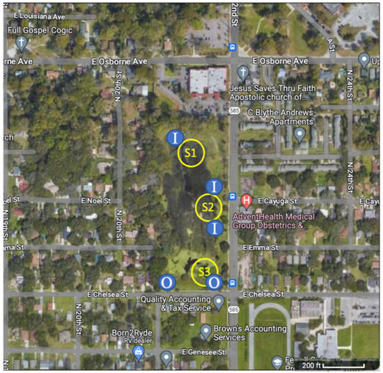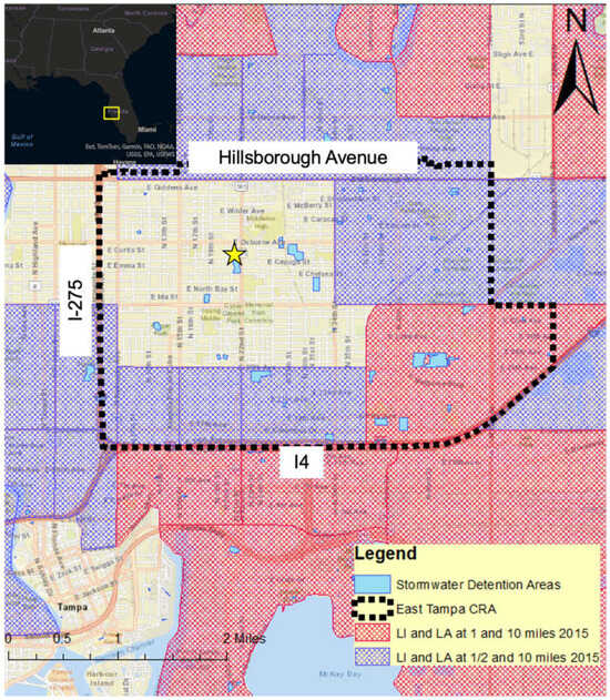 The stormwater pond is located at N. 22nd Street and E. Chelsea Street in East Tampa, Florida, a historically African American community. East Tampa is surrounded by two major highways (I-4 and I-275) and has state roads (Hillsborough Avenue, Martin Luther King Jr.) that run through it. Approximately 33% of the population lives below the poverty level [29] and the community faces food justice challenges (Figure 1). The population of this community is 16,355 [30].