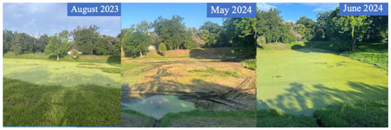The values for pH in this study are similar to other studies on stormwater ponds in the Tampa Bay area [44,45] and generally fell in the acceptable State of Florida ranges (6.5 to 8.5). Monitoring three stormwater ponds in the Tampa Bay area from 1996 to 2003, Rushton et al. [45] found that DO levels did not exceed 10 mg/L with lower levels of DO in ponds covered in floating mats of vegetation [45]. Similar observations for low DO levels were observed in this study (Figure 4). Though conductivity ranges fell within the 50 to 1500 µS/cm ranges found in lake and river water in the U.S., some values fell outside the range to support healthy fish populations (150 to 500 µS/cm) [46].