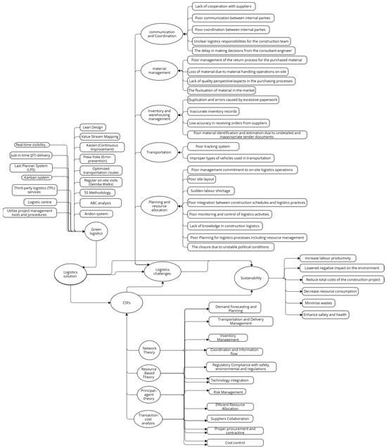 This section presents a comprehensive theoretical framework that examines the interrelationships between logistical challenges, solutions, critical success factors (CSFs), and sustainability in the construction sector. By integrating principal–agent theory (PAT), transaction cost analysis (TCA), resource-based View (RBV), and network theory, the framework offers a novel approach to analysing how logistics practices influence sustainability in the construction industry. These theoretical perspectives emphasise the importance of aligning stakeholder objectives, minimising transaction costs, optimising internal resources, and strengthening network connections to achieve sustainable outcomes.