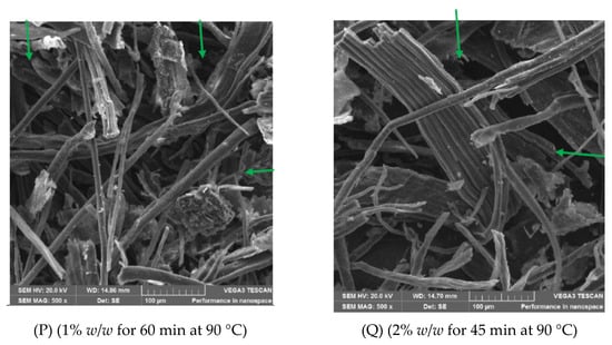 Further microstructure alterations and the rupture of Xyris capensis can be observed in Figure 2R, which shows that an increase in NaOH concentrations improves the degree of feedstock rupturing, which creates more space for microbial activities. Figure 2S shows the lower rupturing of the structure compared to the one noticed in Figure 2R. This indicates that increased NaOH concentrations with lesser exposure time have a lesser impact on the microstructural structure. This was further established in Figure 2T, where a lesser impact could be noticed. This result shows that a longer exposure time has more influence on the microstructural arrangement of Xyris capensis than higher concentrations of NaOH. During NaOH pretreatment, the feedstock fiber arrangement was altered and deconstructed due to the strength of the NaOH, which broke the covalent and hydrogen bonds that bind the feedstock. The images also show that the alkali led to some degree of lignin expansion irrespective of the NaOH concentration and exposure time [26]. The SEM images showed that different treatment conditions had varying levels of degradation on the surface and inner part. NaOH pretreatment could be noticed to create spaces within the feedstock, which could be due to the removal of hemicellulose. Still, the degradation was more pronounced in the external cellulose and lignin arrangement than in the internal parts. This improved polymerization and increased the surface area, enhancing the microbial accessibility and hydrolysis rate. Similar results were observed when Arachis hypogea shells were pretreated under different conditions of NaOH pretreatment [34]. A longer pretreatment time with NaOH on Napier grass was reported to show a significant influence on the microstructural arrangement [58]. It has been noticed that the alkali pretreatment of the lignocellulose substrate breaks down the microstructural structure of the substrate by degrading the inter-unit bonds that make them rough, porous, and irregular [59]. This indicates that the lignin content was altered and removed from hemicellulose and cellulose in the Xyris capensis cell wall arrangements. The SEM images from NaOH-pretreated Xyris capensis show that higher exposure times with lower alkali concentrations produce higher lignin and hemicellulose removal and enhanced cellulose accessibility when digested. This contradicts the report when the same method was applied to Arachis hypogea shells [34]. In this study, higher concentrations with shorter exposure times were reported to have a higher influence on the microstructural arrangement. This could be linked to variations in the feedstocks’ lignin content percentage, and the feedstock’s ages could also be a factor. This investigation has established that higher exposure times enhance the delignification properties, which assist in removing lignin, as reported in previous studies [60]. NaOH pretreatment has been noticed to react with aliphatic and aromatic lignin structures to alter the link between the substrate and cell wall components, enhance the inner surface area, and reduce the polymerization level [61].