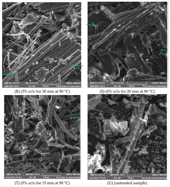 The impacts of different conditions of NaOH pretreatment on the microstructural arrangement of the Xyris capensis were studied with SEM. The SEM images showing the surface morphology of the feedstock picked from pretreated and untreated Xyris capensis are shown in Figure 2. It was observed that NaOH pretreatment conditions had significant impacts on microstructural arrangement when treatments P to T were compared to treatment U. It was noticed that the microstructural structure has a smooth and more intact arrangement with a compact and unaltered microstructure, as presented in Figure 2U. It was confirmed from the image that the original microstructure has a regular, complicated, and stronger microstructural arrangement than the pretreated feedstock (Figure 2P–T). This is aligned with earlier studies that alkali pretreatment methods significantly impact the microstructural arrangement of lignocellulose feedstocks but at varying degrees [34,56]. Images from the pretreated feedstocks show evident transformation after NaOH pretreatment at different conditions but at various degrees. Some level of rupturing and fragmentation with the fickle traces was noticed in the SEM images of the pretreated feedstock. Also, it was observed from the images of the pretreated feedstock that there was an agglomeration of flat and rounded microstructures, which is an indication that the lignin was broken down to make hemicellulose and cellulose available for microorganisms during anaerobic digestion [57]. It can be noticed from Figure 2P that there is a broken and amorphous arrangement, and Figure 2Q shows more broken and chiseled arrangements of Xyris capensis, which increased the crystallinity of the feedstock and was expected to reduce the microorganism accessibility, hydrolysis rate, and biomethane yield.