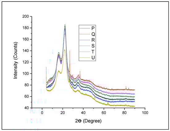 XRD spectra image for NaOH-pretreated and untreated Xyris capensis. P—1% w/w NaOH for 60 min at 90 °C; Q—2% w/w NaOH for 45 min at 90 °C; R—3% w/w NaOH for 30 min at 90 °C; S—4% w/w NaOH for 20 min at 90 °C; T—5% w/w NaOH for 15 min at 90 °C; and U—control.
