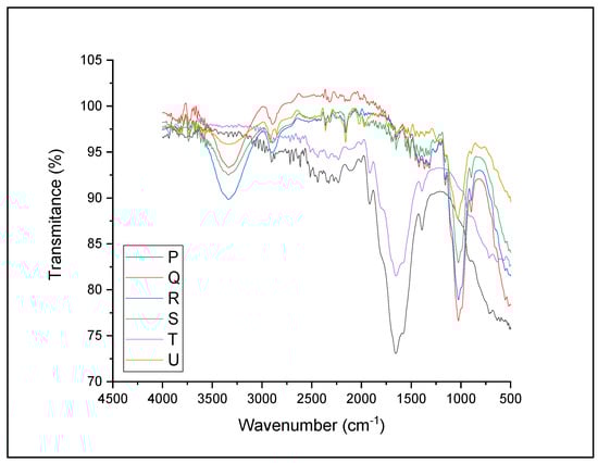 FTIR spectra image for NaOH-pretreated and untreated Xyris capensis. P—1% w/w NaOH for 60 min at 90 °C; Q—2% w/w NaOH for 45 min at 90 °C; R—3% w/w NaOH for 30 min at 90 °C; S—4% w/w NaOH for 20 min at 90 °C; T—5% w/w NaOH for 15 min at 90 °C; and U—control.