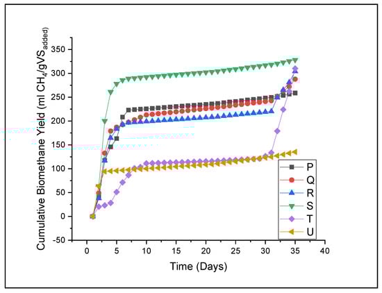 Cumulative biomethane yield of NaOH pretreated and untreated Xyris capensis. P—1% w/w NaOH for 60 min at 90 °C; Q—2% w/w NaOH for 45 min at 90 °C; R—3% w/w NaOH for 30 min at 90 °C; S—4% w/w NaOH for 20 min at 90 °C; T—5% w/w NaOH for 15 min at 90 °C; and U—control.