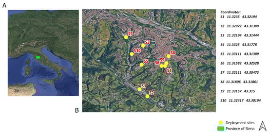 (A) Location of the province of Siena, Central Italy. (B) Deployment sites (n = 10) for lichen and moss transplants across the city of Siena with coordinates (latitude and longitude in decimal degrees).