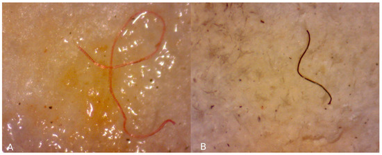 One study, focusing on the biomonitors’ ability to accumulate MFs and performed in Naples, found that the bag enclosing the moss (H. cupressiforme) and lichen (P. furfuracea) samples trapped a large amount of MFs, and the naked samples roughly accumulated a similar total of MFs accumulated by the biomonitors plus the net [39]. This result is logical since MF deposition is, at least largely, a merely passive process. However, it should be noted that the mesh size of the bagging net used by [39] was 2 mm, while our bags had a much wider mesh size of 1 cm. Nevertheless, also in our study, MF interception by the bag is likely since the amount of MFs detected in the exposed samples was modest. In fact, a study conducted in urban parks in Siena using tree leaves [45] reported an average MF deposition of 7.1 ± 0.6 MF/g, corresponding to 600 ± 53 MF/m2, which is higher than the values observed in our study (on average 2.3–2.8 MF/g and 20–194 MF/m2). Moreover, in our study, the deployment of samples below the tree canopy may have caused a shielding effect that could have affected the deposition of MFs since plant canopy can affect air circulation around the biomonitor’s surface [41], and the leaves may have acted as biomonitors themselves, collecting MPs [45], with dynamic fluctuations contributing to the process [50]. As a last issue for consideration, since the length of MFs accumulated was not different between the two biomonitors, as already observed for the same species in their natural environment [37]; considering that the longest fiber measured in our samples was about 4.5 mm, the mesh size of 1 cm was large enough to allow MFs to be deposited on the samples without being necessarily intercepted by the bagging net. However, this issue has not been approached experimentally and cannot be evaluated properly.