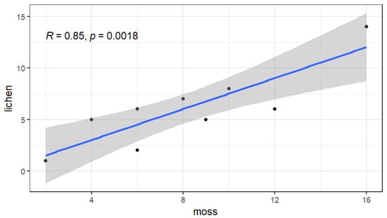Correlation (Spearman’s R) between the number of MFs accumulated (count) by the lichen and moss at the 10 study sites (Table 1).