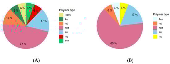 The polymer types identified in MFs accumulated by the moss samples included 47% PET, 18% PP, 12% PE, 6% polyamide (PA), 6% high density polyethylene (HDPE), 6% polyvinyl chloride (PVC), and 6% polyurethane (PU), while MFs in lichen samples included 65% PET, 17% PP, 6% PE, 6% PS, and 6% polyacrylonitrile (PAN) (Figure 4). The difference in the number of polymer types accumulated by the moss and lichen may reflect their specific surface area, but it more likely reflects intersite variation in transplant exposures.