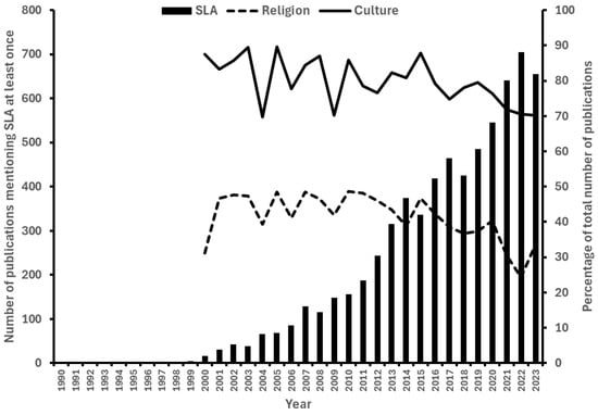 The SLA and its influence within the thinking of development agencies has evolved somewhat since its inception, but it remains a popular framework in both development and research contexts [15,16,17,18]. As an illustration of this popularity, Figure 1 presents the number of published articles (using the Google Scholar search engine) that mention ‘Sustainable Livelihood Approach’ at least once over the period 1990 to 2023. The number of articles increased rapidly from the year 2000 and, at the time of this writing, is between 600 and 700 publications per year. Not all of these would necessarily be scientific journal papers, and, indeed, Google Scholar was selected primarily because it spans a broader range of publication types, such as conference/workshop material and even reports that may be authored by those working in development. Given the avowed ‘people-centric’ nature of sustainable livelihoods and, therefore, the SLA [13,19,20], it is unsurprising that culture and, indeed, religion have often been included as important dimensions to the SLA, but these are typically considered in terms of how they support livelihood. This is a utilitarian perspective, but it is an understandable one given that many religions have structures and systems in place to help support their members, especially at times of shock and stress [13]. Indeed, there can be sophisticated international partnerships of faith-based institutions in place to help support people, be they members of the faith or not [21,22,23]. A shared culture within a community can also provide support mechanisms for livelihood and help them respond to stresses and shocks, and culture can even provide a source of income. Hence, it is perhaps unsurprising that published studies based on the application of the SLA often refer to culture and religion, and this is illustrated in Figure 1, with the two lines showing the percentage of publications that also mention ’culture’ (solid line) and ‘religion’ (dashed line) at least once. While the percentages have declined somewhat since 2010, for ‘culture’, they have been between 70% and 90% of all publications. For ‘religion’, the percentages are smaller but have still been between 30% and 50% of all publications.