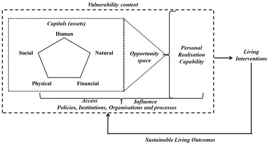 However, it does need to be acknowledged that progressing the SLA framework from Figure 2, Figure 3, Figure 4 and Figure 5, and, indeed, going beyond livelihood altogether to ‘sustainable living’, as shown with the SLivA framework in Figure 6, would be expected to come at a significant cost in terms of practical implementation. The SLA, even as represented by Figure 2, can be a complex and lengthy undertaking [13] given how diverse communities can be in terms of their capitals, as well as the vulnerability and PIP (TSP) contexts, and these can all change over time. Perhaps unsurprisingly, many of the published examples of the application of the SLA, as represented by Figure 2, have tended to focus on specific sectors or issues, and some examples were provided in Table 1. Adding other capitals to include cultural [147], psychological [150], and information/knowledge [145] capitals, as shown in Figure 3, greatly expands this complexity, as, indeed, does the inclusion of ‘opportunity space’ and ‘Personal Realization Capability’—as important as they are in Figure 5 [198]. Proceeding to the next level of the SLivA framework as a means of assessing ‘sustainable living’ (Figure 6) would potentially present an enormous challenge given how variable this may be within a community and, indeed, for the same person over time.