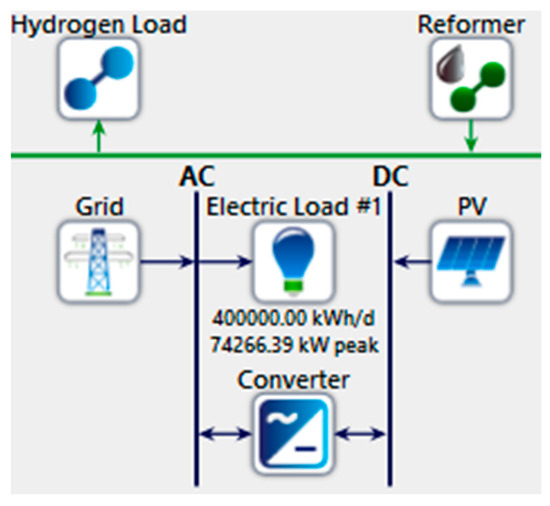 As shown in Figure 6, the hydrogen production system integrates PV panels, grid electricity for reliability, a reformer producing hydrogen through steam methane reforming, and a converter to enable efficient electricity conversion. As can be seen in Figure 6, the system operates to supply the 400 MW/day of electricity required for the area under study through solar cells. If solar energy is insufficient, the national power grid, which serves as a backup, is utilized. Additionally, the hydrogen load required, which is 72,000 kg/day, is provided by the reformer, which uses various fuels for hydrogen production.