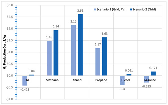 Hydrogen energy can contribute to opening up the path toward a sustainable future. In this work, detailed simulation and optimization for a hydrogen production system were carried out to model the LCOH with HOMER Pro 3.18.3 using six different hydrocarbons—NG, methanol, ethanol, propane, diesel, and gasoline—considering two scenarios to take into account the variations in economic and technical conditions. Scenario 1 is a hybrid system composed of solar panels and the grid, while Scenario 2 is more dependent on non-renewable grid electricity. Figure 7 shows the summary of the LCOH from different sources.