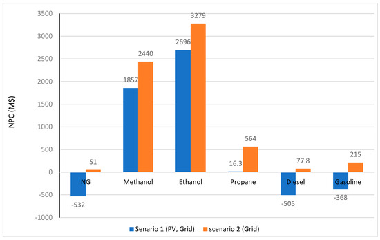 The data represent hydrogen production costs in dollars per kilogram using different hydrocarbons under two scenarios. From the results of the simulations (Figure 8), among such kinds of hydrocarbons, the cheapest method of gray hydrogen production was represented by NG reforming, with an NPC of USD −532 M and USD 51 M in the first and second scenarios, respectively. Blue hydrogen can also be produced by integrating carbon capture into this system, aiding in achieving a carbon-neutral society, albeit with extra added costs to the whole project. The LCOH is, therefore, a measure of total lifecycle costs divided by total hydrogen production over the system’s lifetime. For an integrated cost of the first case of NG reforming at USD −532 million over a lifetime of 20 years, with an annual production of 26,280,000 kg of hydrogen, an LCOH of USD −0.423 per kilogram is obtained. This represents a very competitive value compared to traditional techniques for hydrogen production, particularly when considering future reductions in RE costs. Hence, the LCOH is very low relative to conventional hydrogen production methods, demonstrating the competitiveness of this system.