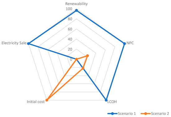 The initial cost of the hydrogen production system is a critical factor for many stakeholders who are sensitive to upfront investment. Scenario 1 scored zero in this category, indicating a very high initial capital cost. While this may deter some investors, it must be weighed against the low NPC and LCOH, which represent long-term economic benefits. The initial investment in Scenario 2 is relatively low, scoring a perfect 100. Such a low initial investment will make it easier to access and, hence, deploy more stakeholders with limited capital—a potential distinct advantage for Scenario 2.