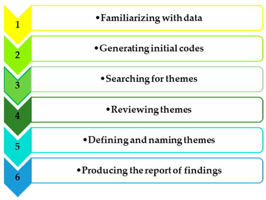 In line with the approach outlined by Braun and Clarke, thematic analysis in this study was conducted in six phases: familiarization with the data, generating initial codes, searching for themes, reviewing themes, defining and naming themes, and finally, reporting the findings []. Additionally, thematic analysis is a process carried out over time. Braun and Clarke proposed six stages for performing thematic analysis, which are illustrated in Figure 1.