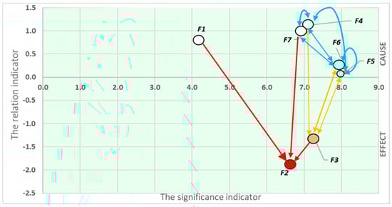 Using the S + R and S − R values from Table 5, it can be determined that the factors located above the X-axis have a positive D-R value, indicating that they function as causes, where their influence on other factors is greater than the influence they receive. These factors include F1, F4, F5, F6, and F7.