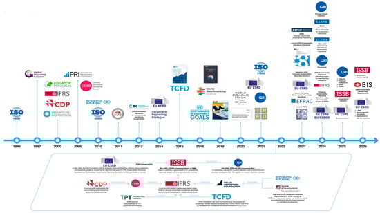 Key milestones in sustainability disclosure [,,,,,]. Source: IFC, 2024 [].