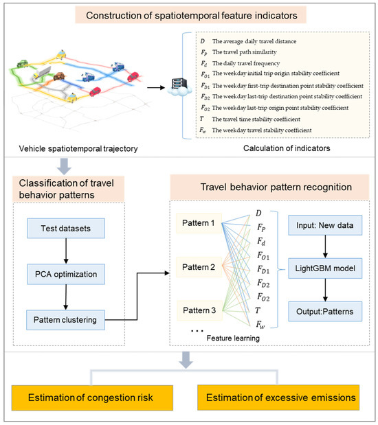 The congestion risk estimation method for various travel behavior patterns proposed in this paper is illustrated in Figure 1. The study is structured into three key components: (1) the construction of spatiotemporal characteristic indices for travel behavior, (2) the classification and recognition of travel behavior patterns, and (3) the estimation of congestion risk. Each of these components is described in detail in the following sections.