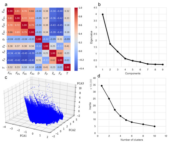 Dimensionality reduction and cluster number determination. (a) the feature correlation heatmap; (b) the scatter plot; (c) the scatter plot of feature data after dimensionality reduction; (d) the plot showing the relationship between the number of clusters and the within-cluster sum of squares.