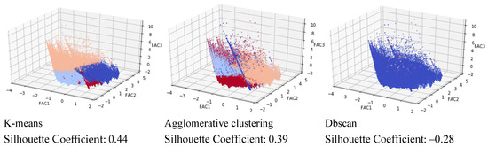 Based on the method described in Section 2.1.2, we obtained clustering results using three different clustering methods, as shown in Figure 4. The silhouette coefficients for the three clustering methods are 0.44, 0.39, and –0.28, respectively. The K-means clustering algorithm performed the best, followed by the Agglomerative clustering algorithm. The DBSCAN algorithm is not suitable for pattern partitioning in this method, possibly due to the uneven distribution of feature indicator data.