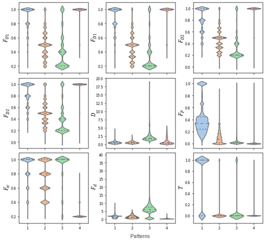 Violin plot of spatiotemporal feature indices. Different colors in the figure represent different patterns.