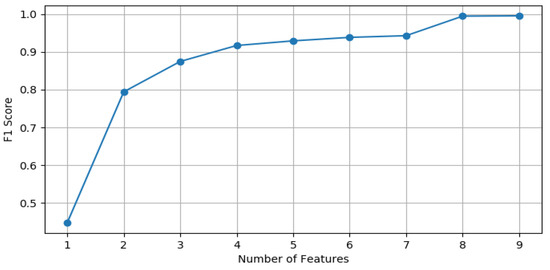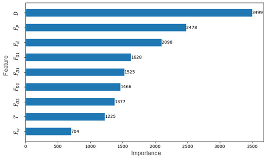 Based on the pattern division results, we constructed a classification model suitable for large-scale scenarios following the method outlined in Section 2.1.3. Utilizing nine feature variables, the trained LightGBM classification model achieves an F1-score of 0.99, demonstrating high precision and efficiency in recognition. However, calculating the nine feature variables for a massive number of individuals in large-scale scenarios poses a challenge, exacerbated by the intercorrelations among these variables. Therefore, to address this issue, we ranked the feature importance, as depicted in Figure 6, and tested the impact of different feature quantities on the classification recognition performance, as shown in Figure 7.