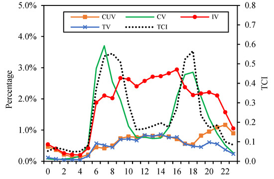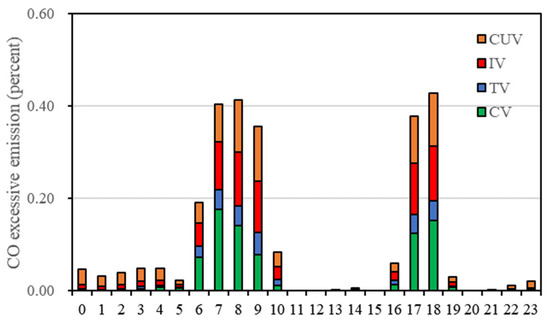 Figure 13 illustrates the distribution of excessive emissions for each pattern. Excessive CO emissions exhibit a trend consistent with the overall traffic flow, showing a bimodal distribution. During the morning peak hours, CO emissions from congestion account for 41% of the total emissions, while during the evening peak, they account for 43%. An interesting phenomenon is that CUVs, accounting for only 15.17% of the total, and IVs, accounting for 43.15%, produce nearly the same amount of excessive CO emissions during peak hours. Although CVs patterns rank third in terms of congestion duration, they have the largest excessive CO emissions. This indicates that commuters do not perceive congestion as significantly as other travelers, but their gas pollution is the largest.