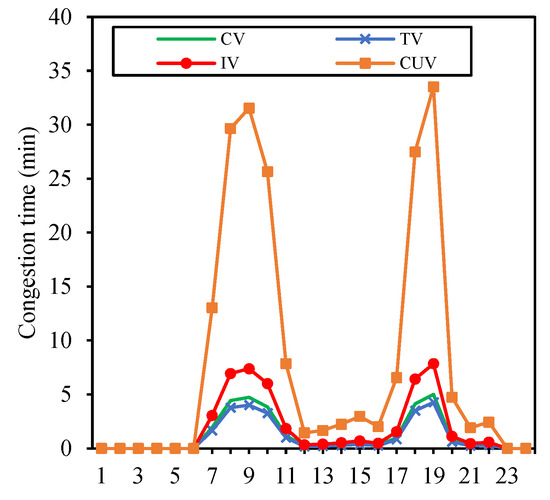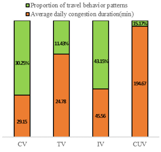 where represents the congestion exposure time for a single trip of vehicle data corresponding to the th travel pattern, represents the preset congestion coefficient [43], taken as 1.5 in this paper, and represents the total number of vehicles for the th travel pattern.