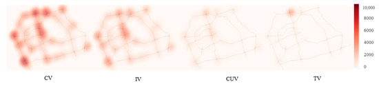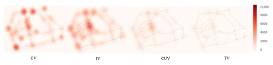 Furthermore, the congestion points of IV and CV patterns overlap significantly, suggesting similarities or a high degree of commonality in their travel routes. CUV patterns only overlap with CV patterns in the city center, while TVs patterns overlap with CVs patterns on the outer ring.
