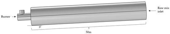 Figure 3 shows a simplified diagram of a rotary kiln in a cylindrical structure with a length of 50 m. A burner is installed at the kiln’s left end, with a fuel inlet into the kiln. The kiln is inclined at 3° to support the passage of the material from the higher end to the lower end through gravity and rotational motion.