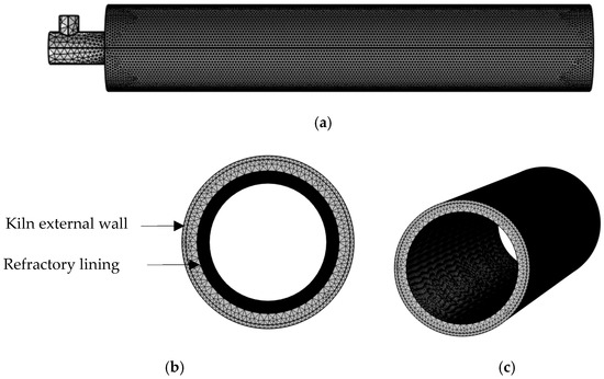 A mesh-dependence study was conducted, and the mesh was appropriately refined to balance detail and computational efficiency. Figure 4 was designed as a physics-controlled mesh suited for heat transfer analysis in materials. The element size was set to extra fine in critical areas such as the burner and transitioned to coarser grids towards the middle of the kiln, which enhanced the accuracy of thermal gradient analysis while optimising processing resources. A tetrahedral mesh was used for the heat transfer simulation. A total of 270,250 cells in the radial directions were used to simulate the entire kiln, using a curvature-based mesh. Figure 4b shows the wall meshing and the refractory, and Figure 4c indicates the mesh along the kiln axial. The mesh was finely tuned with an element size as small as 1 mm in critical areas, such as around the burner, to accurately capture complex thermal gradients. In the middle sections of the kiln, where less variability is expected, coarser grids of approximately 5–10 mm were utilised. This strategic gradation ensured that about 30% of the total 270,250 cells (approximately 81,075 cells) were concentrated in the detailed regions near critical interfaces, while the remaining 70% (around 189,175 cells) were allocated to the broader, less critical areas. The mesh quality metrics were optimised, achieving an average aspect ratio of around 3, a skewness below 0.4, and orthogonality deviations within 10 °C from the ideal. These adjustments enhanced the accuracy of the simulation and computational efficiency, effectively capturing all relevant phenomena, including fluid flow and chemical reactions within the kiln.