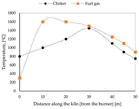 The results obtained in Figure 6 show the clinker temperature peaking at about 1450 °C and the fuel gas temperature at around 1600 °C. These are the temperature ranges commonly used in rotary cement kiln operations [41,42,43,44,45,46], which show that the clinker reaches its peak sintering temperature near 1400–1450 °C, while the flame or gas stream may exceed 1500–1600 °C. This alignment indicates that the heat transfer processes and the overall thermal profile observed from the model results are consistent with the behaviour documented in similar rotary kiln studies.