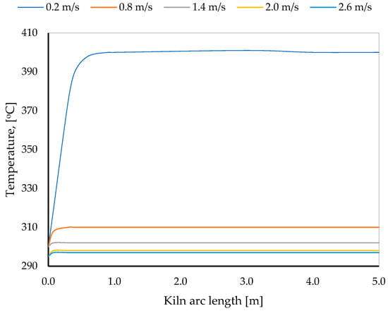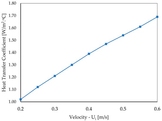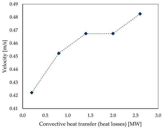 Figure 9 shows the relationship between convective heat transfer and gas velocity within the kiln, based on Equation (4). The convective heat transfer increases with the velocity of the gases. This trend indicates that higher gas velocities enhance the heat transfer coefficient, leading to more significant energy transfer but potentially greater losses as well, necessitating a careful balance for optimal kiln operation.