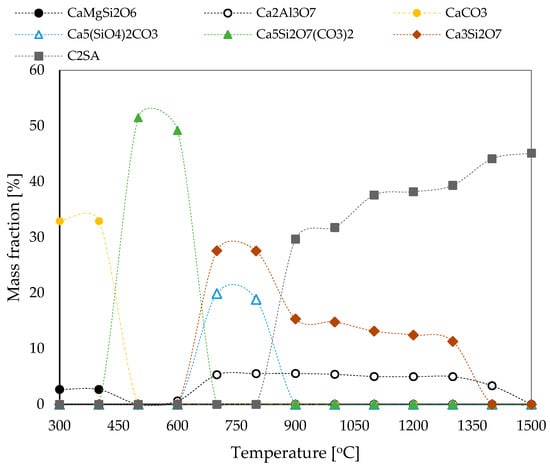Figure 10 shows the mass fraction of different mineral phases in clinker as a function of temperature, providing important information about thermal processing dynamics during clinker formation and the implications for heat losses. CaMgSi2O6 emerges at 450 °C and stabilises by 600 °C, demonstrating thermal stability in the absence of significant reactions at higher temperatures.