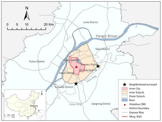 The geographical locations of the neighborhoods surveyed in Nanjing, China.