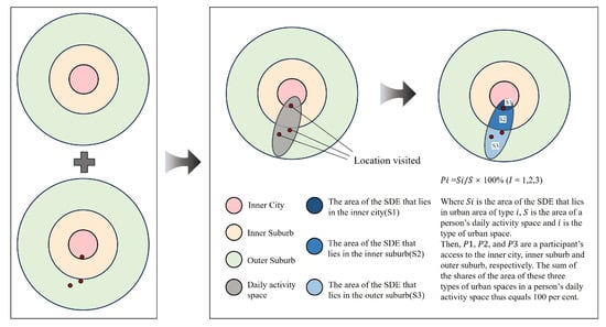 To quantify the ease of access to urban spaces, the proportion of specific urban areas within an individual’s activity space can serve as an indicator. For this case study, as shown in Figure 2, we calculated the percentage of an individual’s daily activity space located in the inner city (P1), the percentage of an individual’s daily activity space located in the inner suburb (P2), and the percentage of an individual’s daily activity space located in the outer suburb (P3). Then, P1, P2, and P3 are a participant’s access to the inner city, inner suburb, and outer suburb, respectively. The larger the p value, the more this individual used this type of urban space, and the more likely it is to obtain urban resources in this area, and vice versa. The sum of the shares of the area of these three types of urban spaces in a person’s daily activity space thus equals 100%.