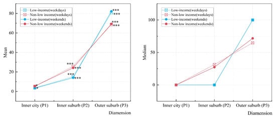 The situation on weekends is different: compared with the non-low-income participants, the low-income participants have fewer leisure activities in the inner city and inner suburb but more in the outer suburb. In addition, participants in the low-income groups have fewer work and personal activities in the inner city, but significantly more working activities in the suburban areas than that of participants of the non-low-income groups. The data analysis above indicates that the two different income groups in their use of the urban space present an obvious difference. The low-income individuals are more dependent on the local space for employment, shopping, leisure, and other activities. However, the non-low-income individuals have more opportunities to go to the advantage urban space with ample employment opportunities and recreational facilities for their daily life. These differences highlight the limited mobility and spatial constraints of low-income groups. As a result, the daily activity trajectories of the two income groups rarely overlap, reducing opportunities for interaction and communication, even when they reside in the same neighborhood.