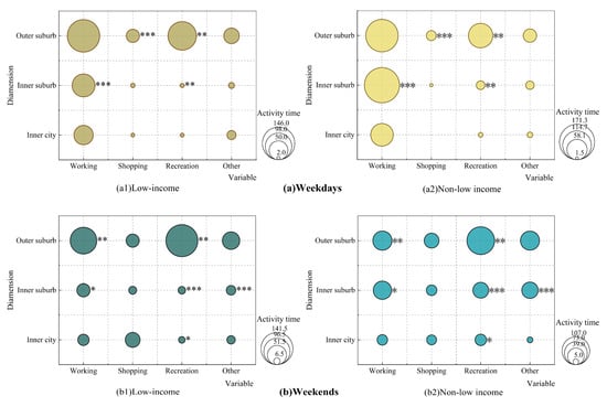The activity time of different income groups in different urban spaces (mean value, min). Notes: * Significant at the 0.10 level. ** Significant at the 0.05 level. *** Significant at the 0.01.