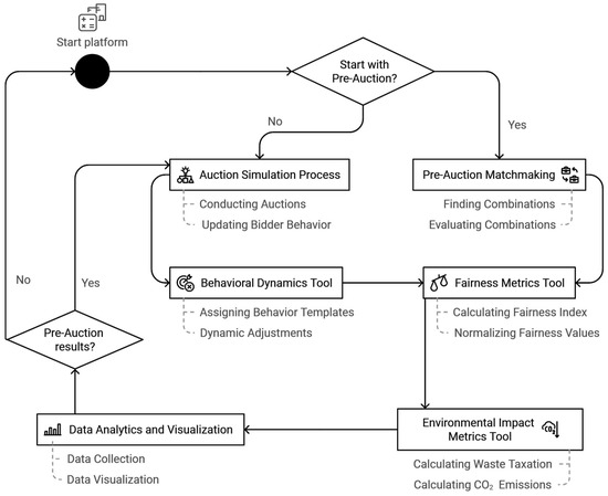 Figure 1 illustrates the structure of the DSM framework, showing how the DSM model is combined with mechanisms, tools, and the platform. The DSM model serves as the conceptual foundation, combining environmental impact assessments, fairness assessments, and bidder behavior analysis into a unified logic for analyzing auction scenarios. The operational procedures or algorithms of the model are referred to as mechanisms, guiding how the model’s logic is applied during the platform functions. The platform that hosts this model acts as the technological environment where these concepts are brought to life, allowing users to simulate auction processes and assess outcomes in practice. Within this platform, specific tools are employed to perform key functions; for example, tools for calculating environmental impacts and fairness metrics or for simulating bidder behavior dynamics.