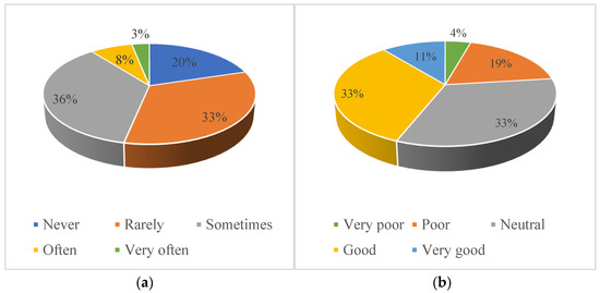 Referring to the rate of the air quality in the metropolitan area of Târgu Mureș, Romania, the structure of the responses is presented in Figure 1a. The mean of 3.27 calculated on a Likert scale, where 1 represents “very poor” and 5 represents “very good”, indicates that on average, most respondents are neutral to slightly positive; additionally, 33% rated as “good” and 11% as “very good”. In Figure 1b, the results are presented for how often they experienced problems related to air quality. The mean of 2.4, calculated on a Likert scale where 1 represents “never” and 5 represents “very often”, indicates that, on average, respondents rarely encounter issues with air quality in the metropolitan area of Târgu Mureș; specifically, 20% responded “never”, 33% “rarely”, and 36% “sometimes”. In total, only 11% experienced problems with air quality in metropolitan area of Târgu Mureș. Only 31% of respondents were aware of any initiatives in their area aimed at improving air quality.