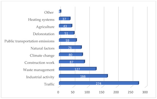 In Figure 2, the main factors affecting air quality in the respondents’ area are presented. Traffic ranked first, identified by 274 respondents (85.4%), followed by industrial activity with 166 respondents (51.7%), waste management with 127 respondents (39.6%), and construction work with 87 respondents (27.1%). The least selected factor, indicated by only 11.5% of respondents, was the heating systems as an element affecting air quality.