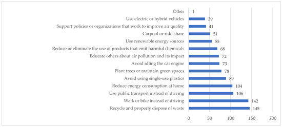Regarding the actions that respondents personally take to reduce air pollution, the hierarchy extracted from a multiple choice question presented in Figure 3 shows that the most common action is recycling and properly disposing of waste, reported by 145 respondents (45.2%). This is followed by walking or biking instead of driving, cited by 142 respondents (44.2%), and using public transport instead of driving, mentioned by 106 respondents (33.0%). Reducing energy consumption at home was identified by 104 respondents (32.4%), avoiding single-use plastics by 89 respondents (27.7%), and planting trees or maintaining green spaces by 78 respondents (24.3%).