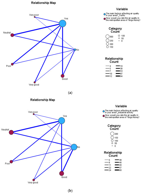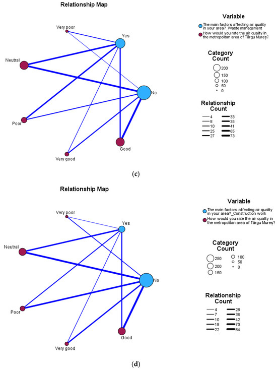 The relationship maps from Figure 4 show the intensity of the relationship between opinions based on ratings referring to the main four factors that affect the air quality in metropolitan area of Târgu Mureș. So, for the traffic factor, those respondents who indicated the traffic as one of the factors that affected the air quality, opted also for neutral and good. For industrial activity, the same options can be observed as for traffic. For waste management and construction work, the opinions are different from those which indicate traffic and industrial activity as the main factors that affect air quality.