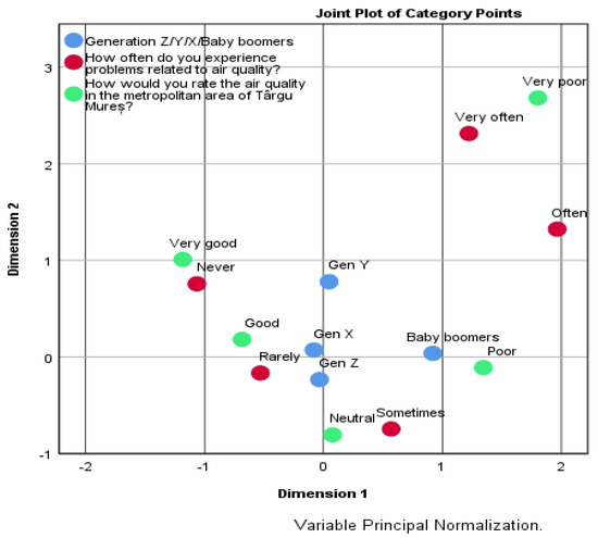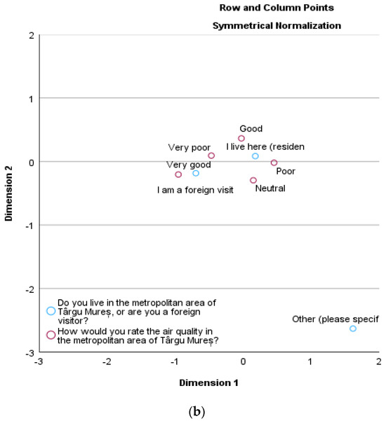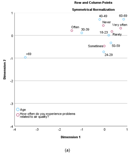 For all the socio-demographic characteristics, the perceptual maps were applied to identify the profile of the citizens (residents or not, age, gender, etc.) for each important variable from the research, as follows: the rate of air quality, the experiencing of problems related to air quality, and the first four factors that—in respondents’ opinions from this study—affect the air quality in the metropolitan area of Târgu Mureș. So, for age and the ratings awarded for the air quality, and for age and the experiencing of problems related to air quality, the perceptual map analysis returned some results (marked with yellow in the tables), but these were not statistically significant for p-value < 0.05 and had low values for Cramer’s V symmetric measures (Table 6 and Table 7).