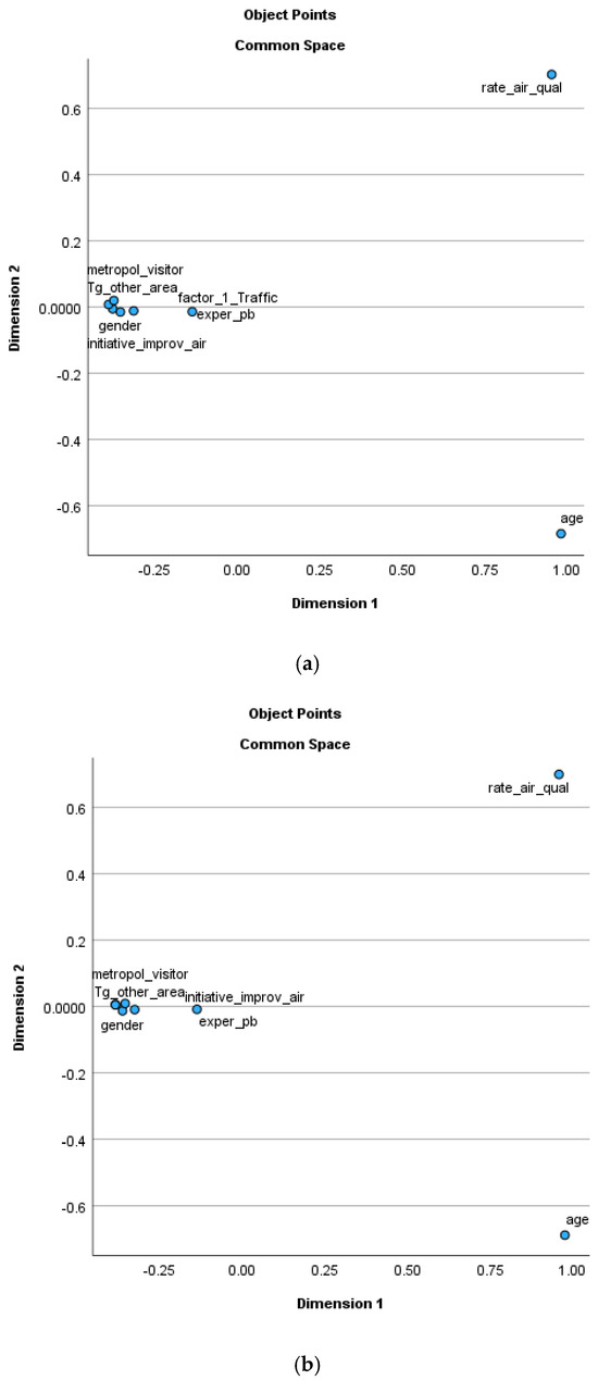 For examining dissimilarities and similarities among respondent groups, the PROXSCAL multidimensional scaling (MDS) technique was applied. These procedures generated perceptual maps that illustrated how respondents were grouped based on their socio-demographic profiles and air quality perceptions, providing a deeper visual insight into patterns of agreement or divergence.