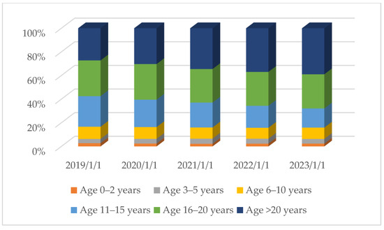 If we take into account another way of grouping the age of cars, for the same period, according to the reported data, 77.6% of cars are older than 12 years, 10.9% are between 9 and 12 years, 6.6% are between 6 and 8 years, and only 4.9% are between 0 and 4 years. Regarding the structure of cars according to type of engine (Figure 9), the mean for the last five years show a percentage of 53% for diesel, 39.6% for gasoline, only 0.6% for hybrid vehicles, and 0.1% for electric vehicles.