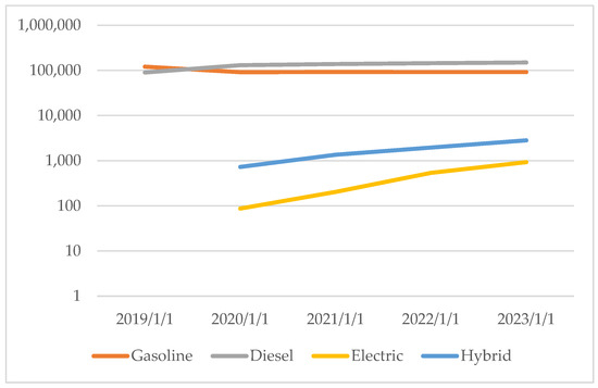 The trends of cars in relation to fuel source are presented in Figure 9, with an exponential increase for the electric and hybrid types of engine, starting from 2020, the moment when the Romanian Government applied an attractive buying program for these type of cars.